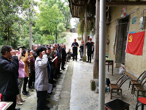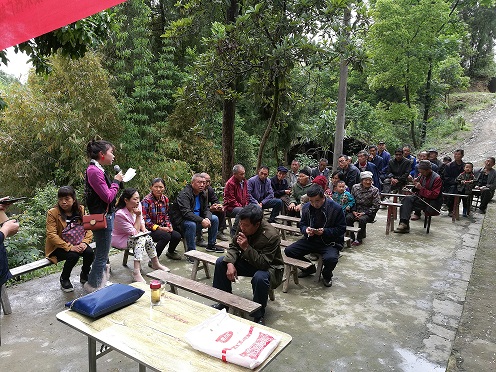 出发前,全站干部职工自费购买了一批慰问品和茶叶瓜子花生,带上了党旗和志愿者服务队队旗,到达后,会场定在三组组长黄汝财家的小院坝中,提前接到组长通知的三组农户和党员们早早的就来到会场,还不知道会议内容的人们自觉地坐在安放在院坝中的条凳上,沉默着,这个春日上午的农家小院子,一时有些沉闷。随着头戴志愿者小红帽、举着红旗的市种子技术推广站干部职工到达,一部分人找到自己的扶贫联系户热情的打招呼、嘘寒问暖;一部分人开始搭建会场,拉横幅、挂旗子,会场立即热闹起来。当职工拿出党旗找地方悬挂时,组里的几位老党员眼睛立刻亮了,走上前来帮忙出主意找地方,有的找锤子、钉子,有的搭板凳,在几位老党员和热心村民的帮助下,职工们很快就把会场搭建起来,布置好了。